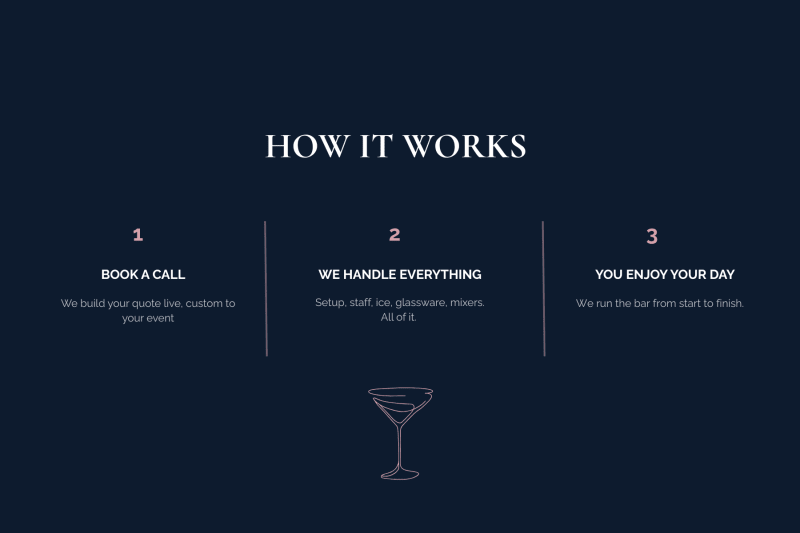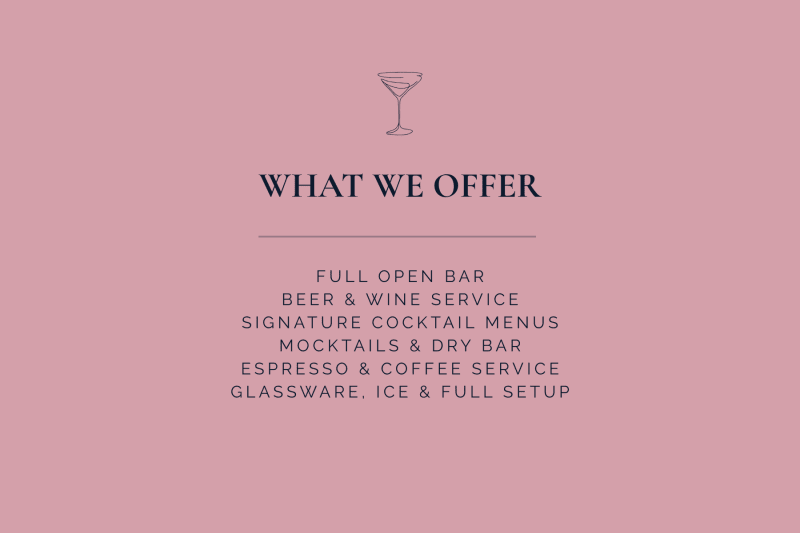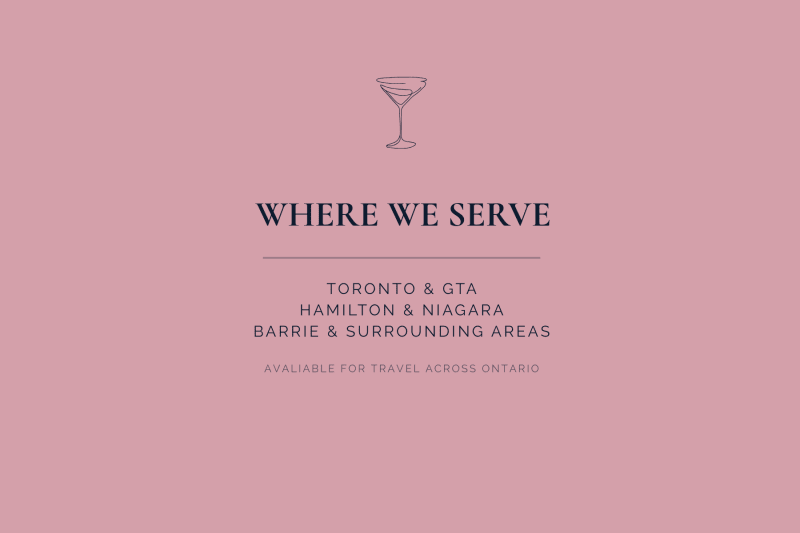 T.O. Bar Co. is a fully mobile bartending company based in Toronto, serving weddings and events across the GTA. We bring everything: bar setup, staff, glassware, ice, mixers, and equipment, so venues don't need a built-in bar. We offer full open bar, beer and wine, mocktails, espresso service, and custom cocktail menus. Every quote is custom and built on a call with the client.